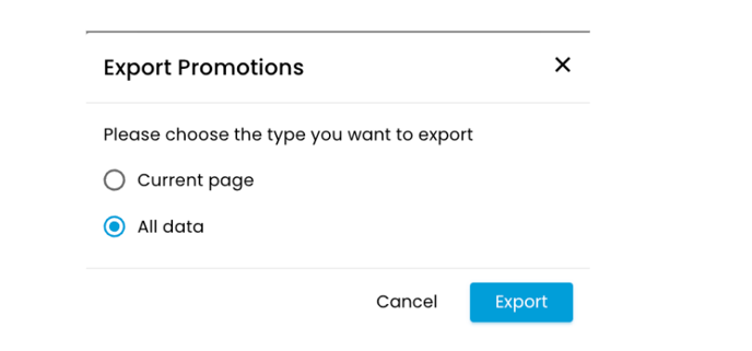 - In the far right hand side, click the down arrow icon called ‘Export’. Once clicked, a pop-up will appear which offers you an export of two options: Current page - which is the current tickbox selection or All data which enables you to extract all promotional information from that tab.